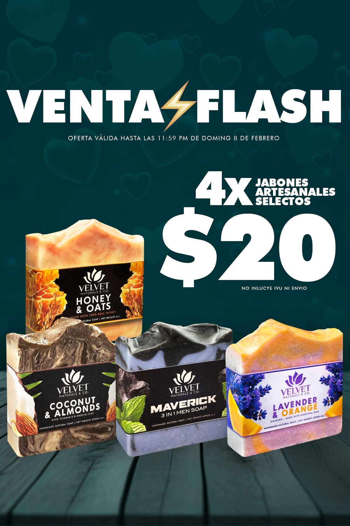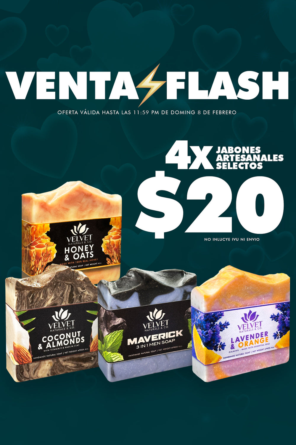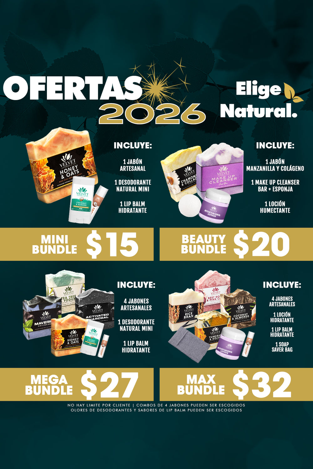 ¡Crea tu propio paquete! Selecciona 4 jabones por solo $24 y disfruta de un paquete personalizado hecho a tu medida. Combina tus favoritos, descubre nuevos aromas y cuida tu piel con productos naturales en cada barra.