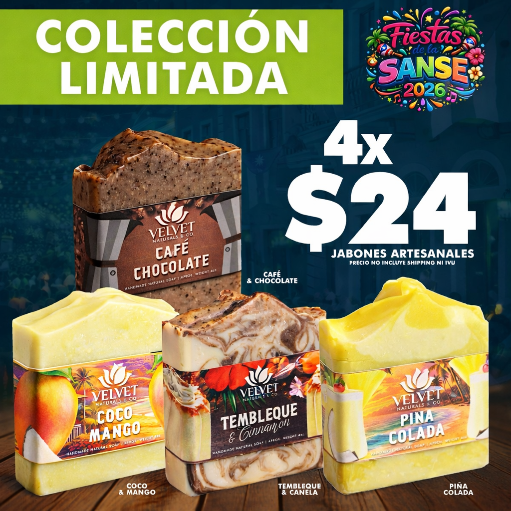 Disfruta una combinación especial de 4 jabones artesanales elaborados a mano con ingredientes de alta calidad y aromas irresistibles que evocan sabores y tradiciones tropicales.